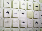 The drawings are arranged in a 30x30cm grid that extends from floor to ceiling. Suspended precariously on the ends